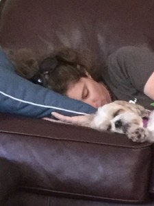 I mean, even the sunglasses atop my head are stupid. But there I am, just moments after returning from Georgia, napping on the couch with my dog. I’m spooning the dog.