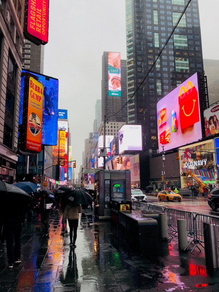 The wet cold settled into us until we made it back to our hotel to gather our belongings. Our feet were soaked. Our clothes needed some time with a hotel hair dryer. But the colors. The colors. The colors in Times Square laid like mosaics in the wet streets. It was far more vivid than the dry days we walked it. Sometimes there are gifts in the rain. And colors in the rainy streets.