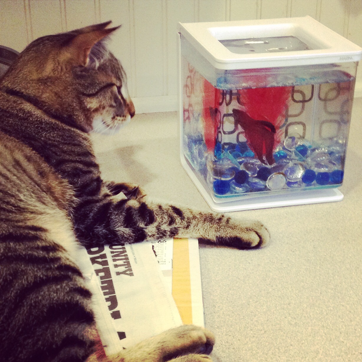 Steve knew that cats and fish were not friends. He knew, because he knew things. It was against house rules set by the humans. But all Steve wanted was companionship. So when the family left the house, for non-cat activities, Steve would hop up to the table and commune with Swift. Swift did not know as many things as Steve knew. That’s how it is for fish and cats. But Swift, for all he didn’t know, knew that Steve was not his friend. Steve was to be feared. For awhile, Swift managed to circle his bowl at just the perfect speed and trajectory to make Steve a tad sleepy. During this honeymoon period, they appeared to be friends. Steve would sit bowlside, peacefully thinking about ways to further cement this relationship. He tried everything. Long gazes under the glow of the moonbeams spilling through the blinds. Reading the news to Swift. Pucker faces.