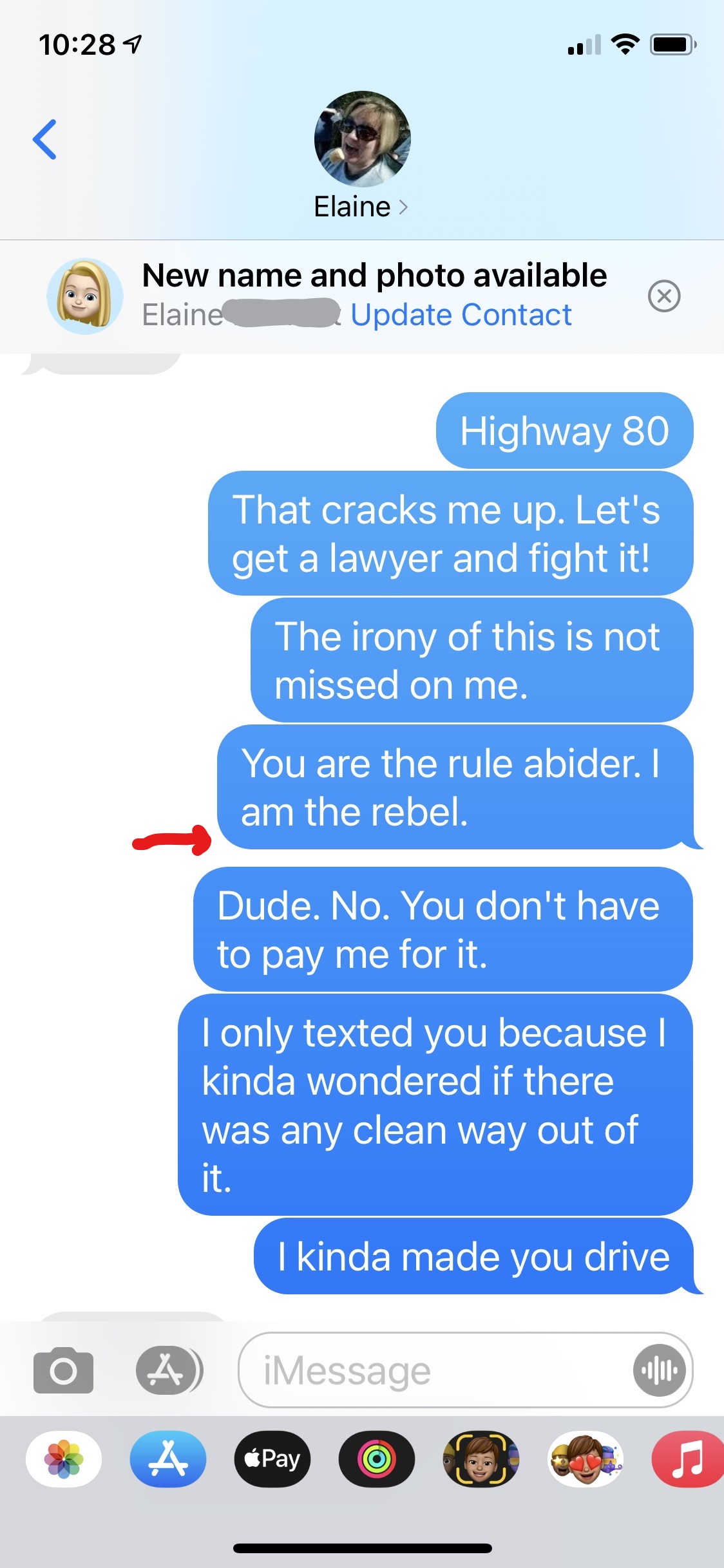 “I go back and forth between ‘whatever’ and ‘NUH UH’ on the photo speeding ticket I just received from the state of GA by way of Chatham County, TN. It highlights that I was speeding in a school zone at improper times. $75 ticket plus $25 processing fee (oh brother!). I’m guessing I should just pay it and obviously I can. But the ridiculousness of the explanation makes me want to fight. Can’t fight GA, though. I’d have to go there to fight.” (I can be pretty verbose while texting.)